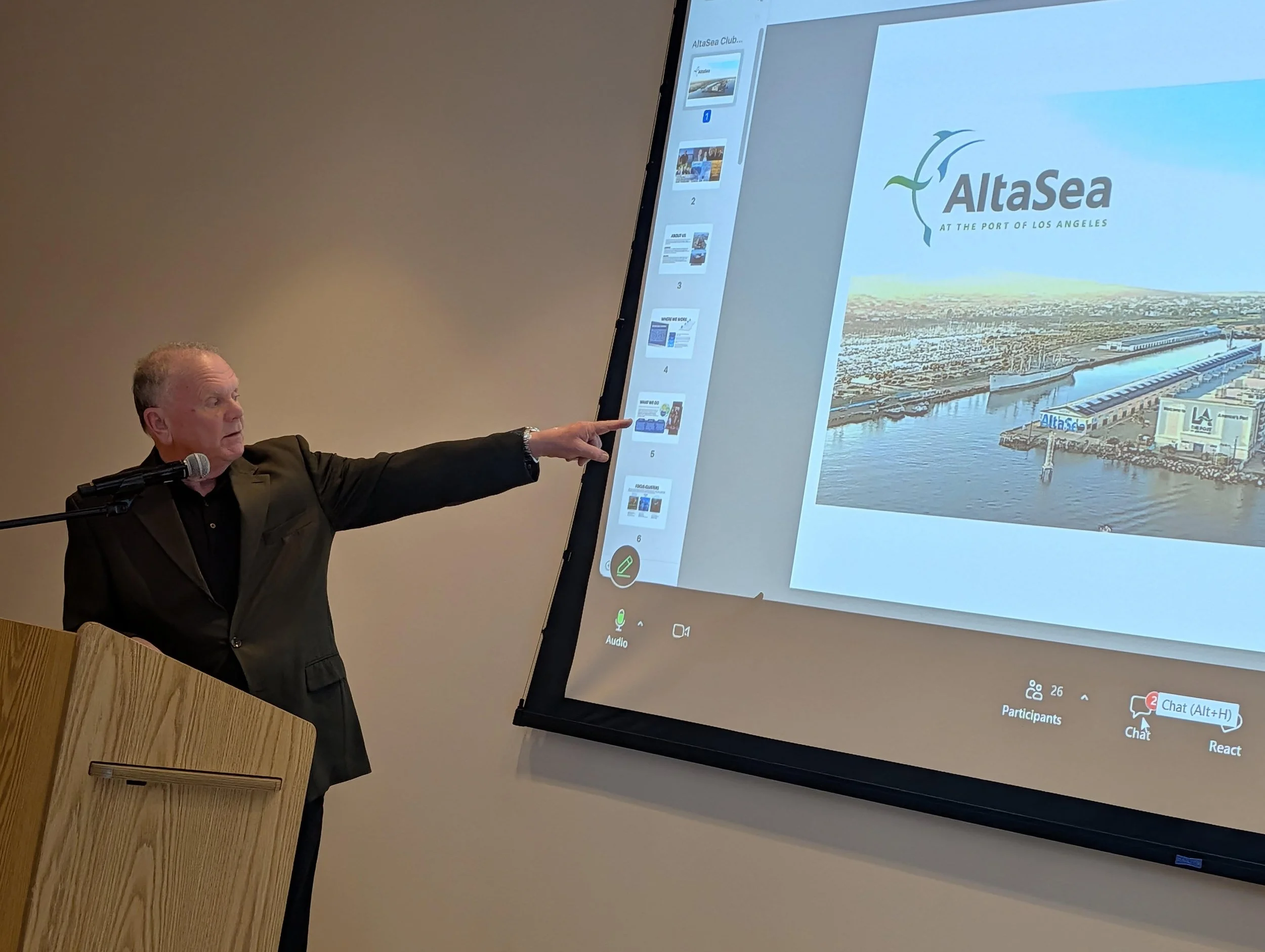 Terry presented an overview of AltaSea, a non-profit organization based in the Port of Los Angeles, highlighting its mission to promote the blue economy through education, workforce training, and research. He discussed the organization's efforts in regenerative aquaculture, ocean carbon dioxide removal, and decarbonizing ports using hydrogen energy. Terry emphasized the importance of understanding the planet's ocean resources and the potential for the blue economy to become a trillion-dollar global industry, with Los Angeles having a significant role to play.