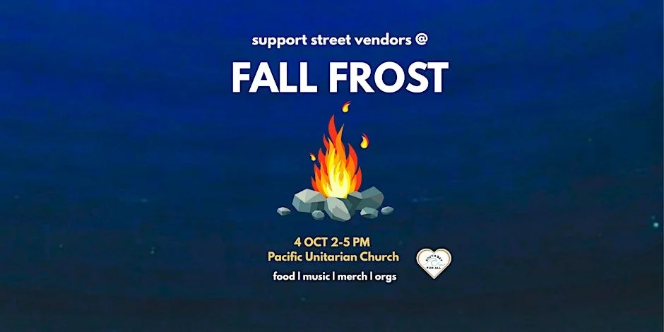 Join South Bay For All for FALL FROST, Oct 4, 2–5 pm at Pacific Unitarian Church! Food, music & activities to support street vendors. Enjoy pepian, tortas, elotes & more from local vendedores, + entertainment by South Bay artists. All proceeds aid vendors & our rental fund.