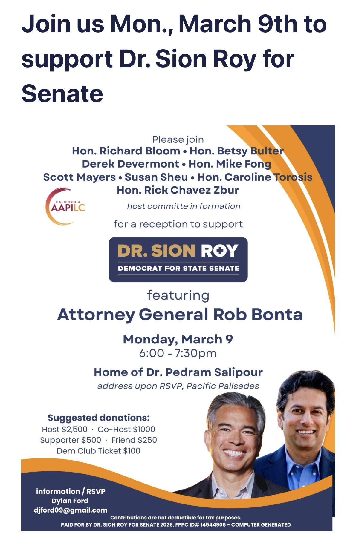 Fundraiser for Dr. Sion Roy for State Senate District 24 Monday, March 9, 2026 6:00 PM 7:30 PM Pacific Palisades, CA (map) Google Calendar ICS
