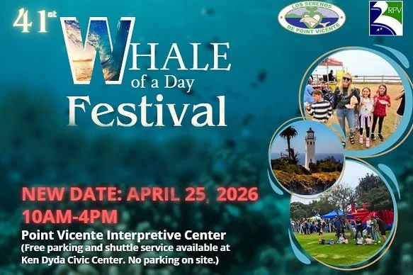 Whale of a Day Festival Saturday, April 25, 2026 10:00 AM 4:00 PM Point Vicente Interpretive Center (map) Google Calendar ICS The Palos Verdes Democrats will be hosting a table at this year’s Whale of a Day Festival at the Point Vicente Interpretive Center in Rancho Palos Verdes on Saturday from 10 am to 2 pm. Stop by and enjoy the fun and chat with our volunteers.